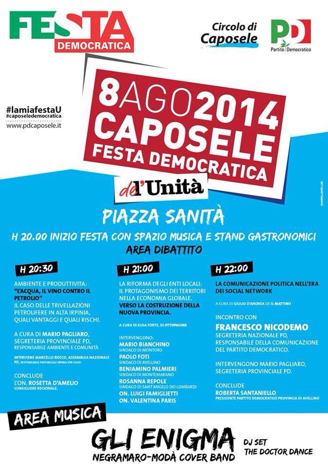 È pronto il programma della Festa che il circolo del PD di Caposele realizzerà venerdì 8 agosto a partire dalle ore 20.00. Un programma che vuole farsi carico delle questioni politiche di attualità nel dibattito provinciale. Tre saranno gli spazi di discussione previsti.
