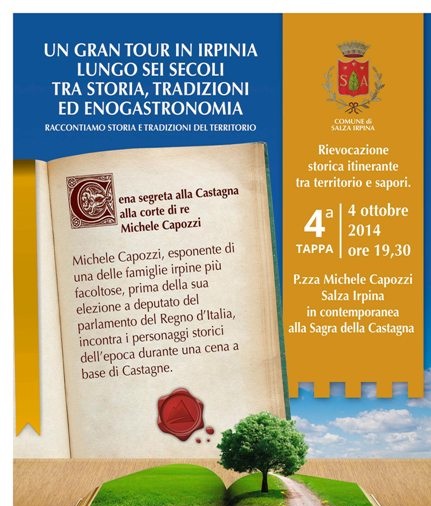 Una trama coinvolgente per uno spettacolo che valorizzerà sia una delle figure che hanno fatto la storia del territorio assieme ad una delle principali eccellenze agroalimentari dell’area. Al fine di ampliare l’opera di valorizzazione di tale prodotto, la quarta tappa del Gran Tour in Irpinia si svilupperà in concomitanza con la popolare Sagra della Castagna, primo grande appuntamento enogastronomico del ricco autunno irpino dedicato alla valorizzazione del rinomato prodotto ortofrutticolo, giunta alla sua XXXI edizione e che proseguirà anche domenica 5 ottobre. L’evento proporrà prelibate specialità gastronomiche locali a base di castagne e sarà allietato da musica live. Ad arricchire l’esperienza vi sarà l’esposizione fotografica “Irpinia terra di: castelli, fede, gusto e sorgenti” dedicata alla valorizzazione dei diversi aspetti del territorio irpino.