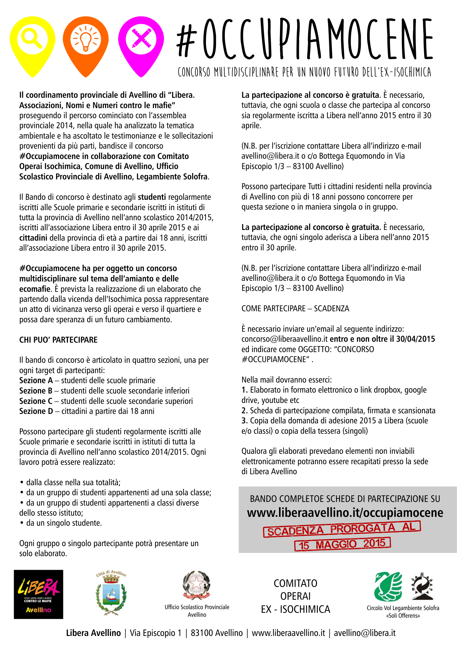 Proprio per permettere un più ampio coinvolgimento e partecipazione, infatti, il termine ultimo per la presentazione degli elaborati è stato spostato al 15 maggio 2015. Il bando completo e la scheda di partecipazione è disponibile all’indirizzo www.liberaavellino.it/occupiamocene