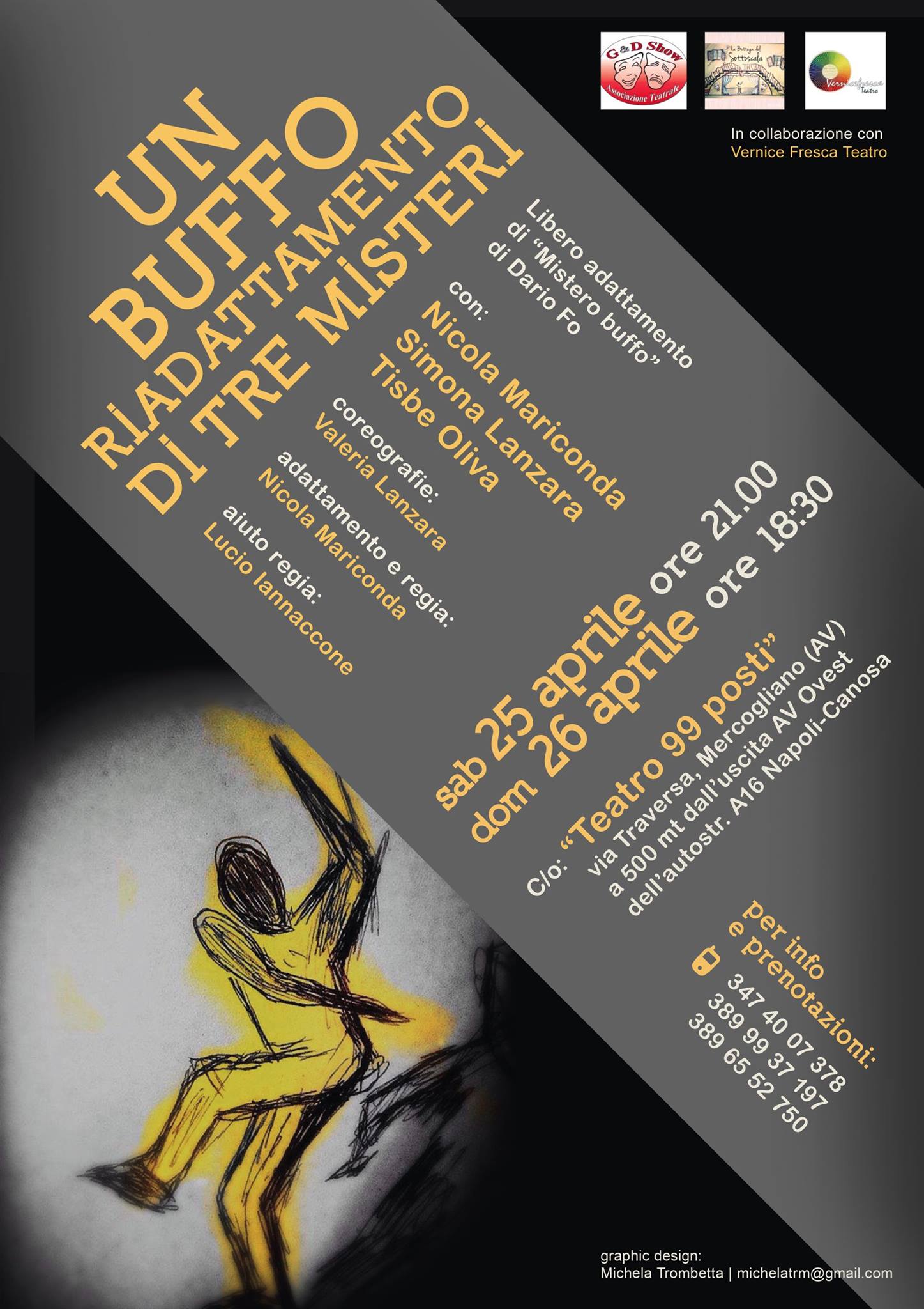 Mercogliano – “Il teatro visto da qui”, prima rassegna teatrale firmata Vernicefresca Teatro, giunge al suo terzo appuntamento. In scena Sabato 25 e Domenica 26 Aprile rispettivamente alle ore 21:00 e alle ore 18:30 presso il Teatro 99Posti di Mercogliano, lo spettacolo “Un buffo riadattamento di tre misteri” ideato e realizzato dall’attore campano Nicola Mariconda, che rielabora e riscrive, servendosi di altri dialetti, tre testi tratti da “Mistero Buffo” di Dario Fo, tre Giullarate:
