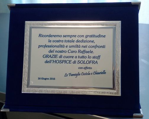 Queste le toccanti parole che le famiglie Ciotola e Chiariello hanno fatto incidere sulla targa, che hanno poi donato al personale dell’Hospice di Solofra:“Ricorderemo sempre con gratitudine la vostra totale dedizione, professionalità e umiltà nei confronti del nostro caro Raffaele. Grazie di cuore a tutto lo staff dell’Hospice di Solofra. Con affetto. Le Famiglie Ciotola e Chiariello”.
