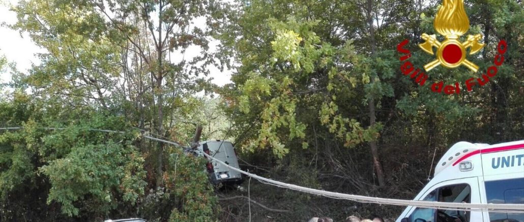 Sturno – La squadra dei Vigili del Fuoco del distaccamento di Grottaminarda, nel pomeriggio del 13 agosto, è intervenuta per un Incidente stradale, che ha visto coinvolto un furgone con alla guida un uomo di 82 anni originario di Frigento, il quale mentre percorreva la via Cerze D’agosto, nel comune di Sturno, urtava violentemente un muro salendo su di una scarpata alta circa 2 metri, e finiva la sua corsa tra gli alberi, urtando anche un Palo della Telecom.