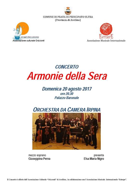 Prata Principato Ultra – Domenica 20 agosto 2017, alle ore 20.30, si terrà presso il Palazzo Baronale il Concerto ”Armonie della sera”, a cura dell’Orchestra da Camera Irpina. Il Concerto, organizzato dall’Associazione Culturale “Orizzonti” di Avellino, in collaborazione con l’Associazione Musicale “Euterpe”, è l’evento di punta del cartellone estivo “Eventi d’Estate” a cura dell’Amministrazione Comunale di Prata Principato Ultra. L’Associazione Orizzonti, fondata il 12 agosto 2012, persegue obiettivi di promozione e diffusione della cultura, delle scienze e dell’arte, intese sotto ogni loro forma espressiva; la promozione e la tutela dell’individuo con particolare riferimento alle fasce deboli quali minori, giovani, anziani, diversamente abili e stranieri.