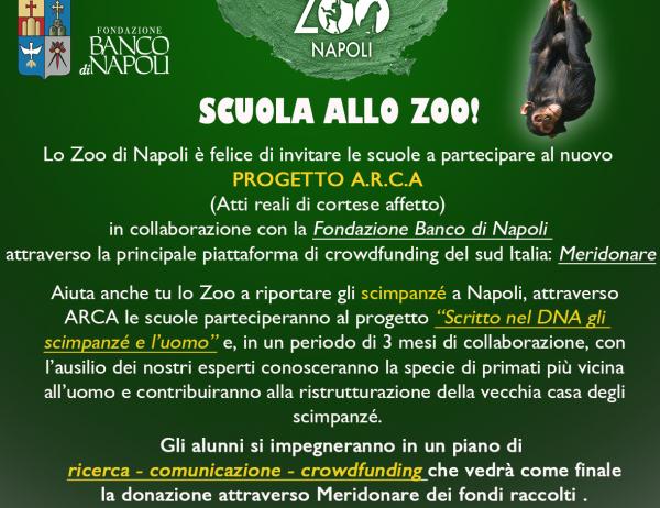 Napoli – Con una azione capillare sul territorio campano, ma anche al contrario, di richiesta alla struttura organizzatrice, lo ZOO DI NAPOLI, invita le scuole di primo e secondo grado, a partecipare al nuovo PROGETTO A.R.C.A. (Atti Reali di Cortese Affetto). Un titolo significativo, per una azione realizzata in collaborazione con la Fondazione Banco di Napoli attraverso la principale piattaforma di crowdfunding del Sud Italia Meridonare, finalizzata ad aiutare lo Zoo di Napoli a riportare gli scimpanzé a Napoli, grazie alle scuole che vi parteciperanno.