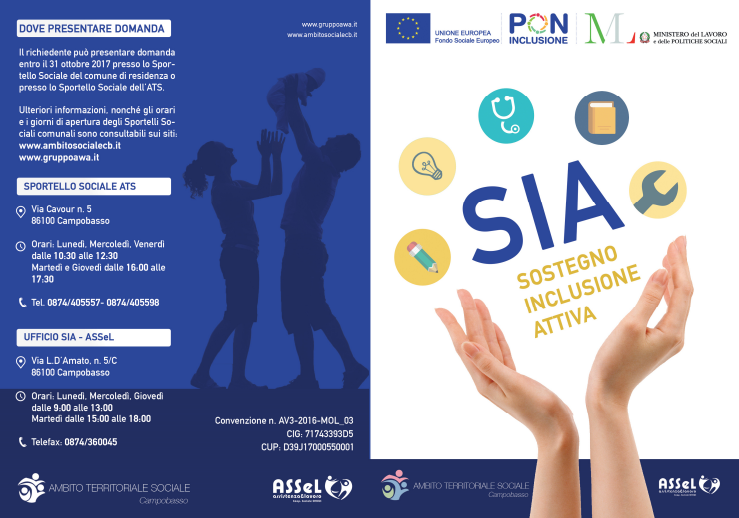 È possibile fare richiesta per la SIA entro e non oltre il termine perentorio del 31 ottobre 2017, presso lo Sportello sociale del Comune di residenza o presso lo Sportello ATS. Ulteriori informazioni sono consultabili presso i siti: www.ambitosocialecb.it e www.gruppoawa.it.