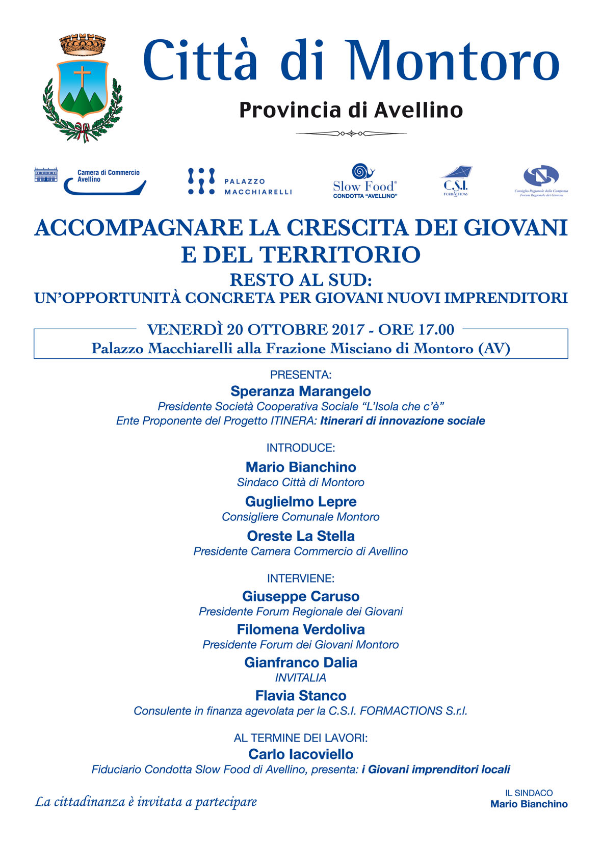 Senza Nome-2Montoro – “Accompagnare la crescita dei giovani e del territorio.Resto al Sud: un’opportunità concreta per giovani nuovi imprenditori” è il tema del convegno promosso dal Comune di Montoro per venerdì 20 Ottobre 2017 ore 17 a Palazzo Macchiarelli, Frazione Misciano di Montoro. L’appuntamento è realizzato in collaborazione con la Camera di Commercio di Avellino, Palazzo Macchiarelli, Slow Food Condotta Avellino, C.S.I. Formactions srl, Forum Regionale dei Giovani. Presenta Speranza Marangelo Presidente Cooperativa Sociale L’Isola che c’è (ente proponente Progetto Itinera); introducono Mario Bianchino Sindaco di Montoro,Guglielmo Lepre consigliere Comunale Montoro, Oreste La Stella Presidente Camera Commercio Avellino.