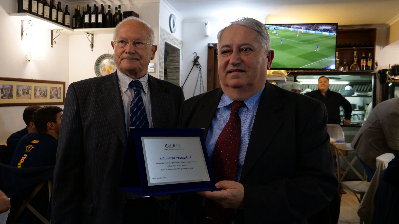 Napoli – Nello splendido scenario sul golfo di Napoli del ristorante “ Il Caminetto “ di Michele Ragosta, in via Manzoni, si è svolta la premiazione dell’USSI ( Unione Stampa Sportiva Italiana) di quattro giornalisti che si sono particolarmente distinti ( per l’alta professionalità e per la lunga appartenenza al Sindacato dei giornalisti sportivi). Il prestigioso premio è toccato per la provincia di Avellino a Giuseppe Petrucciani ( decano dei giornalisti sportivi irpini ) da sempre impegnato a difesa dei valori e tutela della categoria.