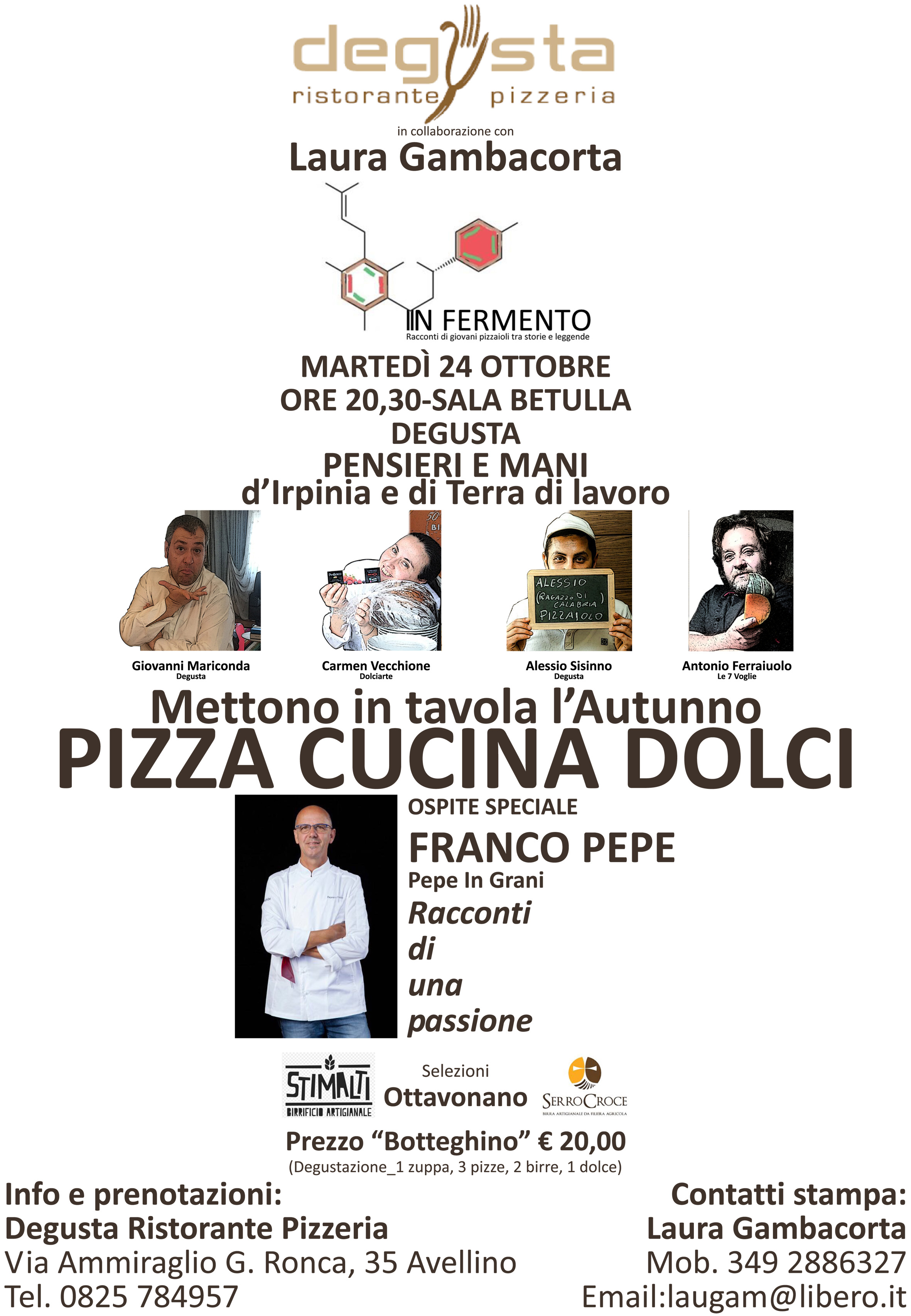 Avellino – Sarà Caserta la prima provincia protagonista del ciclo di appuntamenti In Fermento in programma presso il ristorante pizzeria Degusta di Avellino a partire dal mese di ottobre. Martedì 24 ottobre alle ore 20,30 a interpretare i sapori dellautunno, accanto a Giovanni Mariconda e Alessio Sisinno, rispettivamente chef e pizzaiolo del Degusta, saranno la signora della pasticceria Carmen Vecchione di Dolciarte e Antonio Ferraiuolo, patron-pizzaiolo de Le 7 Voglie di San Marco Evangelista. Ospite speciale della serata sarà il maestro Franco Pepe della pizzeria Pepe in Grani di Caiazzo, ambasciatore internazionale delle eccellenze di Terra di Lavoro. La cena si aprirà con un piatto della tradizione irpina proposto dallo chef Mariconda per poi proseguire con le pizze autunnali di Sisinno e Ferraiuolo e terminare in dolcezza con il dessert di Carmen Vecchione. Anche le birre artigianali selezionate per questa serata dallesperto Gianluca Polini dellOttavonano di Atripalda, partner dellintero ciclo di appuntamenti, saranno rappresentative dei due territori protagonisti della serata: la Granum di Serro Croce per lIrpinia e laStaScocciata di StiMalti per la provincia di Caserta.