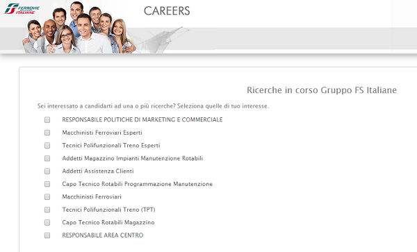 I profili ricercati in tutta Italia sono: macchinisti e ferroviari esperti (con scadenza del bando domani, 25 febbraio); tecnici polifunzionali treno esperti (scadenza sempre il 25 febbraio); addetti magazzino impianti manutenzione rotabili con offerta rivolta ai ragazzi tra i 18 e i 29 anni che verranno inseriti tramite contratto di apprendistato professionalizzante (scadenza questa volta il 28 febbraio); addetta assistenza clienti rivolta sempre ai giovani tra i 18 e 29 anni con diploma e possesso del certificato in lingua inglese livello B2 (scadenza 28 febbraio 2018); capo tecnico rotabili programmazione manutenzione pe contratto a tempo indeterminato (con scadenza il 28 febbraio 2018); macchinisti ferroviari per i giovani tra i 18 e i 29 con l’offerta di uno stage iniziale di 5 anni e successivamente contratto di apprendistato (scadenza 25 febbraio 2018); tecnici polifunzionali treno (tpt) per uno stage iniziale di 4 mesi e successivamente contratto di apprendistato (scadenza 25 febbraio 2018).; capo tecnico rotabili magazzino con contratto a tempo indeterminato (scadenza 28 febbraio).