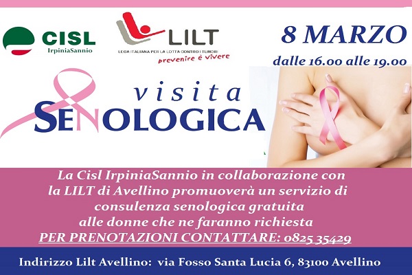 La Cisl Irpinia Sannio in collaborazione la LILT di Avellino promuoverà per il giorno 8 marzo, dalle ore 16 alle 19, un servizio di consulenza senologica gratuita presso l’Auditorium comunale di San Giorgio del Sannio. Interverranno, tra gli altri, il Sindaco Mario Pepe, la Coordinatrice femminile Cisl Irpinia-Sannio, l’Assessore alle Politiche sociali Dottoressa Alessia Accettola. Per prenotazioni contattare il numero 0825-35429.