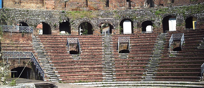 Teatro Romano di Benevento: Databile tra la fine del I e gli inizi del II secolo d.C., sorge nella zona occidentale della città antica. Il monumento, la cui cavea misura circa 98 metri di diametro, è costruito in opera cementizia con paramenti in blocchi di pietra calcarea e in laterizio.