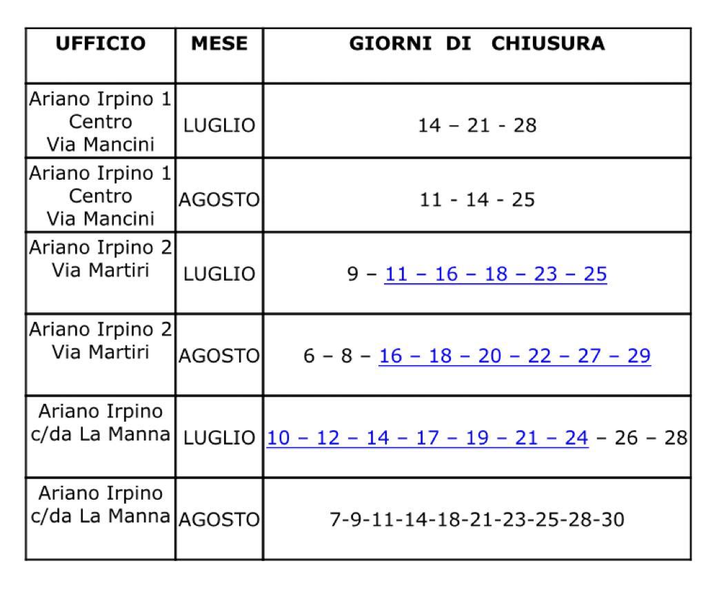 Ariano Irpino – Si informa la cittadinanza che ad Ariano Irpino, dal 9 luglio al 31 agosto 2018, gli Uffici Postali del Centro Via Mancini, Via Martiri e c/da La Manna, effettueranno i turni di chiusura, così come riportato nella tabella. La comunicazione segue ad una nota pervenuta da Poste Italiane, nella quale si comunica una rimodulazione dell’apertura al pubblico degli Uffici Postali durante il periodo estivo.