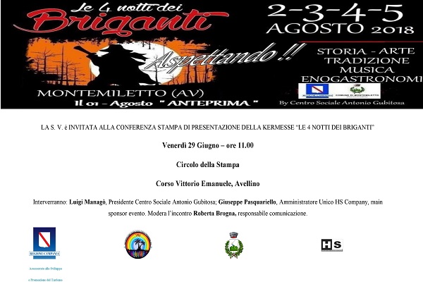 Montemiletto – Il Centro Sociale Antonio Gubitosa presenta alla stampa la II edizione della kermesse culturale dal titolo “Le 4 Notti dei Briganti”. La conferenza stampa di presentazione si terrà al Circolo della Stampa di Avellino venerdì 29 giugno, alle ore 11.00.