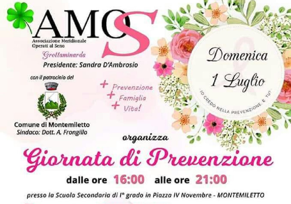 Montemiletto – Amos, l’associazione meridionale operati al seno di Grottaminarda con presidente Sandra D’Ambrosio organizza, con il patrocinio del Comune di Montemiletto con sindaco Antonio Frongillo, una “Giornata di prevenzione gratuita” che si terrà il 1° luglio, dalle ore 16.00 alle 21.00, presso la scuola secondaria di I°grado di piazza IV Novembre .