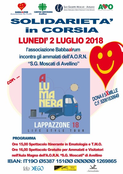 Locandina BabbaalrumAvellino - Il “Lappazzone 18 Life style tour” della band irpina “La Lumanera” fa tappa all’Azienda Ospedaliera “San Giuseppe Moscati” di Avellino, grazie all’ennesima iniziativa di solidarietà organizzata dall’Associazione Babbaalrum, da anni impegnata a contribuire, in qualche modo, ad alleviare le sofferenze degli ammalati e a donare qualche ora di svago anche ai familiari dei degenti.
