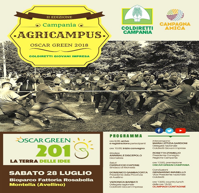 Il programma di AgriCampus prevede la cerimonia di premiazione dell’Oscar Green Campania 2018 a partire dalle ore 10.00, moderata dal giornalista Annibale Discepolo. Si apre con i saluti del sindaco di Montella Ferruccio Capone, del presidente della Provincia di Avellino Domenico Gambacorta e della delegata di Coldiretti Giovani Impresa Campania Veronica Barbati. A seguire gli interventi di Maria Letizia Gardoni, delegata nazionale Coldiretti Giovani Impresa, e di Rosetta D’Amelio, Presidente del Consiglio Regionale della Campania. Le conclusioni sono affidate a Gennarino Masiello, vicepresidente nazionale di Coldiretti.