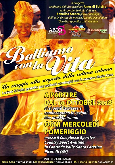 Avellino – Si apriranno il 10 ottobre le iscrizioni per il corso di danza cubana gratuito che si terrà ad Avellino. L’Associazione meridionale operati al seno – Amos Solofra in collaborazione con il CountrySport ha realizzato il progetto “Balliamo con la vita”, coordinato dalla psico-oncologa Annalisa Stanco dell’U.O. Oncologia Medica Azienda Ospedaliera “San Giovanni Moscati” di Avellino.