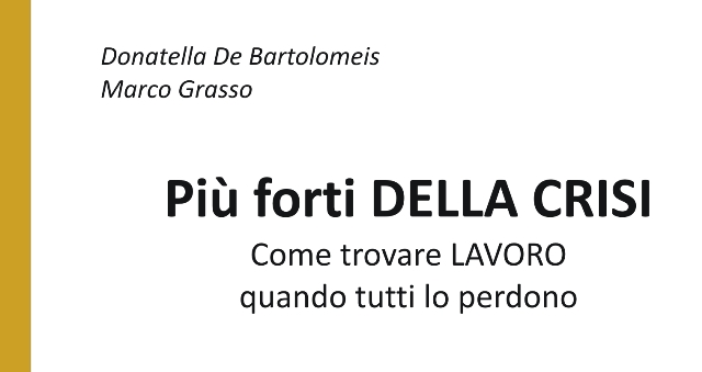 “E’ importante ricominciare da se stessi – insiste Donatella De Bartolomeis, parlando anche per esperienza diretta – E’ necessario che i giovani e meno giovani comprendano che solo centrandosi su se stessi e trasformando le proprie caratteristiche e i propri sogni in punti di forza, troveranno la leva per sollevare gli intralci al mondo del lavoro. Siamo troppo focalizzati su ciò che accade fuori di noi (tasse, raccomandazioni…) per poter vedere con occhio lucido e distaccato i nostri errori e le barriere che non ci fanno evolvere. Crescere è un atto di coraggio, ma anche un atto dovuto. È per questo che ho deciso di mettere anni e anni di studi e formazione sull’argomento al servizio degli altri. Insieme Cambiare si può.”
