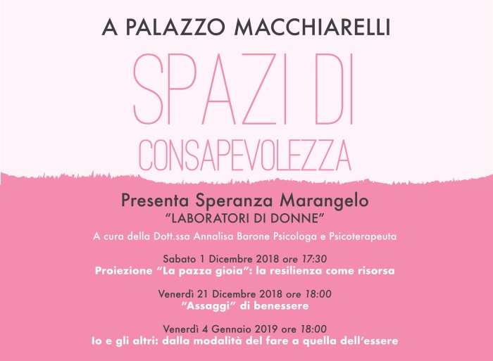 A Palazzo Macchiarelli spazi di consapevolezza, Speranza Marangelo presenta: Laboratori di Donne a cura della Dott.ssa Annalisa Barone Psicologa e Psicoterapeuta. Sabato 1 dicembre 2018 ore 17:30 Proiezione “La pazza gioia”: la resilienza come risorsa. Venerdì 21 dicembre 2018 ore 18:00 “Assaggi” di benessere. Venerdì 4 gennaio 2019 ore 18:00 “Io e gli altri: dalla modalità del fare a quella dell’essere”. La cittadinanza tutta è invitata a partecipare.