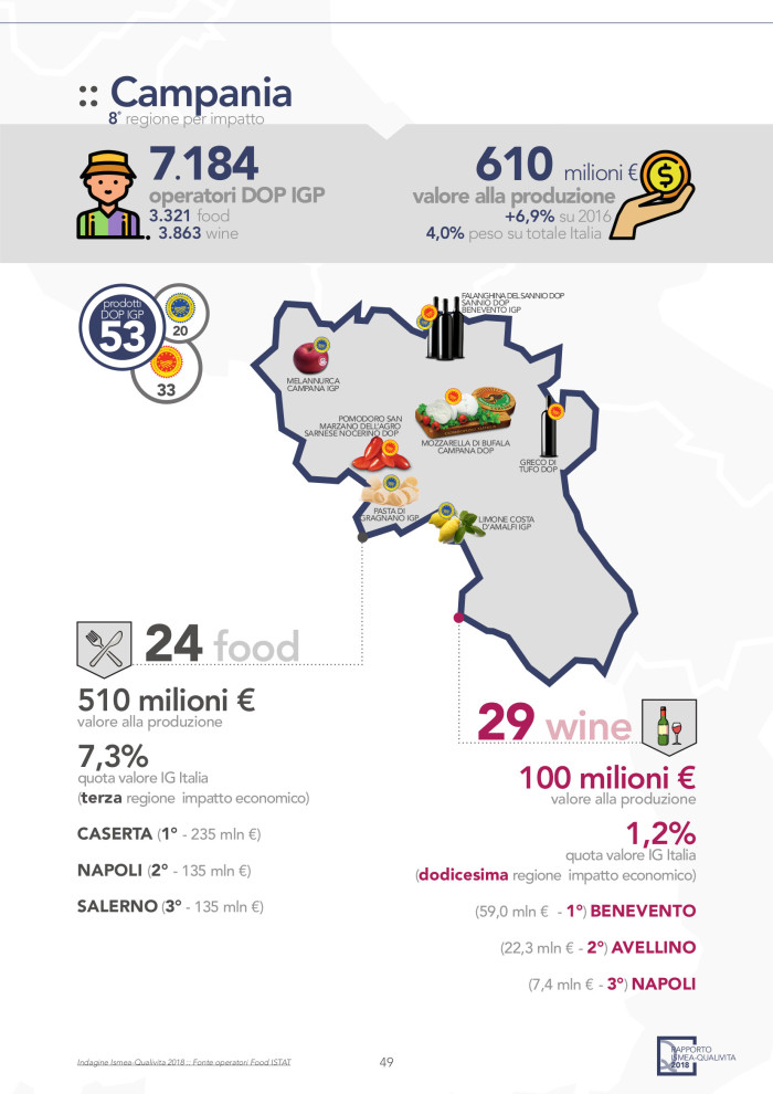 Le Dop e le Igp in Campania sono complessivamente 53, che a arrivano a 55 con le STG. Guardando i singoli comparti, le 24 Dop e Igp del food fanno salire la Campania al terzo posto nazionale con 510 milioni di euro di valore alla produzione e un incremento del 7,3%. A tirare il food campano certificato è la mozzarella di bufala campana dop, che vede infatti la provincia di Caserta prima con 235 milioni di euro, a pari merito Napoli e Salerno con 135 milioni di euro. Nel wine le 29 Dop e Igp fatturano 100 milioni di euro con una crescita dell’1,2%, che vale la dodicesima posizione nazionale. In questo caso guida la classifica la provincia di Benevento con 59 milioni di euro, grazie al boom della Falanghina Dop, seguita da Avellino con 22,3 milioni di euro e Napoli con 7,4 milioni di euro.
