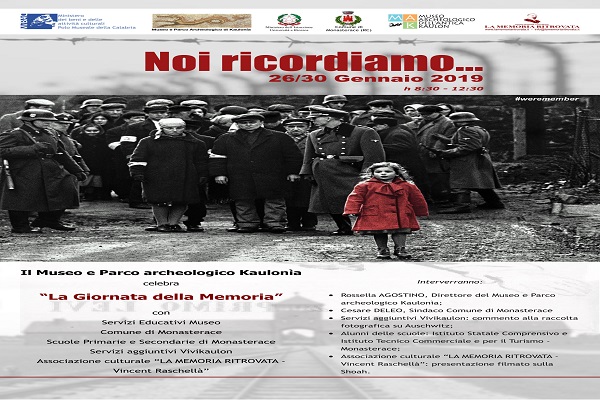 Monasterace - il Museo Archeologico e Parco Archeologico dell’antica Kaulon aderisce alle celebrazioni per la Giornata della memoria con l’evento Noi ricordiamo… che si terrà il 26 e il 30 gennaio 2019. L’iniziativa, a cura dei Servizi Educativi del Museo, vedrà la partecipazione dell’Istituto Statale Comprensivo e delI’Istituto Tecnico Statale del Turismo di Monasterace, dei Servizi aggiuntivi Vivikaulon, nonché dell’Associazione Culturale “La Memoria Ritrovata – Vincent Raschellà”.