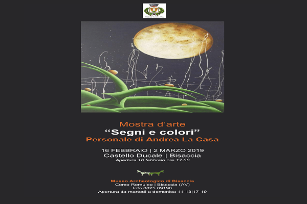 Bisaccia – Sabato 16 febbraio, organizzata dall’Amministrazione Comunale e dal Museo Archeologico di Bisaccia, nella sala esposizioni del Castello Ducale si apre alle ore 17.00 la mostra d’arte dal titolo “Segni e colori”, che vedrà in esposizione le opere di Andrea La Casa. L’artista lucano nasce e opera a Policoro (Matera) dove svolge la sua attività presso lo Studio Art Gallery “Segni e Colori”. Biografia tipica la sua di un artista “giramondo” e i suoi lavori, attraverso i quali palesa una padronanza della tecnica pittorica indiscutibile e una sensibilità nell’uso dei colori fuori dal comune,portano dentro tutti i segni dei suoi viaggi e delle sue tante contaminazioni internazionali. Ha partecipato a numerose mostre riscuotendo consensi positivi dal pubblico e dalla critica, mentre sue opere,elaborate attraverso uno stile che va dal surreale all’astratto,si trovano in diverse collezioni private in Italia e all’estero.