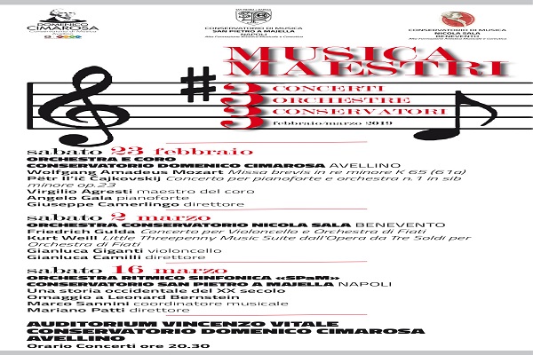Avellino – Sabato 23 febbraio 2019, alle ore 20:30 la splendida location dell’Auditorium di piazza Castello ad Avellino apre il sipario su «Musica Maestri», la nuova rassegna organizzata dal «Cimarosa», presieduto da Luca Cipriano e diretto da Carmelo Columbro, che chiama a raccolta i Conservatori della Campania per tre serate dedicate alla grande musica che coinvolgerà le Orchestre del «San Pietro a Majella» di Napoli e del «Nicola Sala» di Benevento. “Siamo estremamente convinti che le grandi Istituzioni musicali della Campania debbanostabilire un costante dialogo tra di loro al fine di promuovere le eccellenze musicali del territorio e valorizzare i talenti dei giovani alunni dei prestigiosi Conservatori della nostra regione– spiegano il presidente Luca Cipriano e il direttore Carmelo Columbro –In quest’ottica abbiamo immaginato di declinare attraverso tre concerti questa rinnovata sinergia che andrà a condensarsi in una rassegna dedicata alle Orchestre dei Conservatori di Napoli, Benevento e Avellino che si svilupperà tra febbraio e marzo e che, siamo certi, intercetterà il favore di un pubblico sempre più variegato ed esigente”.