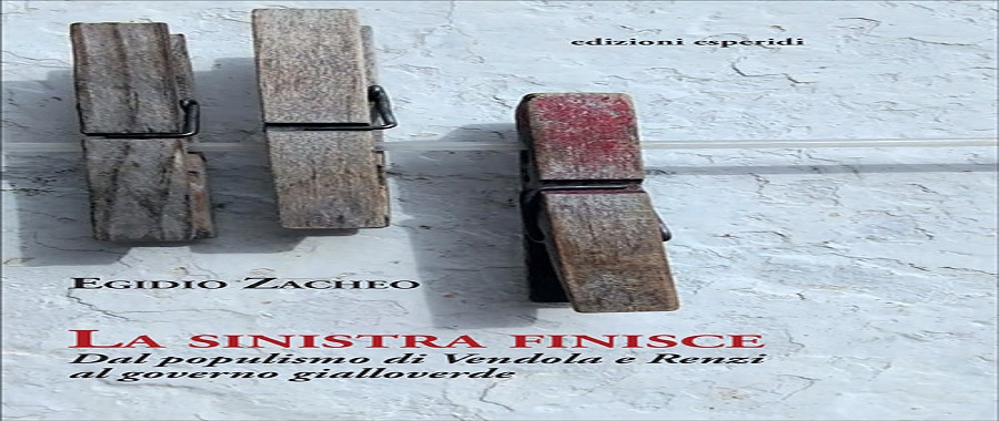 Martedì 5 marzo 2019 alle ore 19.00, presso il Circolo Cultuale “Galilei” a Trepuzzi sarà presentato il nuovo libro di Egidio Zacheo, “La sinistra finisce. Dal populismo di Vendola e Renzi al governo gialloverde”, edito da Edizioni Esperidi. Dopo i saluti del presidente del Circolo Salvatore Capodieci e dell’editore Claudio Martino, sarà Giacomo Fronzi consigliere delegato alle Politiche culturali e docente, a dialogare con l’autore. Egidio Zacheo ha insegnato Scienza Politica presso l’Università del Salento. È stato più volte sindaco di Campi Salentina. Tra le sue pubblicazioni ricordiamo: “Politica e istituzioni nella transizione. L’Italia in Europa” (2000), “Il secolo della democrazia. Politica e diritti nel Novecento” (2003), “Un paese in bilico. Il mio volontariato culturale e politico” (2005), L’anomalia italiana e l’autodafé della sinistra” (2010), “L’identità divisa. L’Italia e il nostro debole spirito pubblico” (2013).