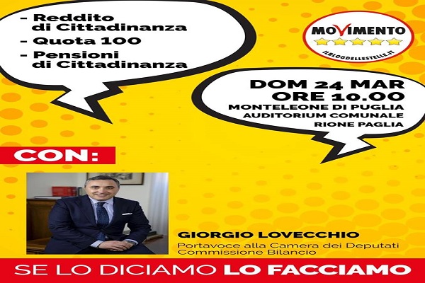 Monteleone di Puglia – Domenica 24 marzo alle ore 10:00 presso l’auditorium comunale di Monteleone di Puglia l’Onorevole Giorgio Lovecchio ha organizzato un’assemblea pubblicasu reddito e pensione di cittadinanza e Quota 100.