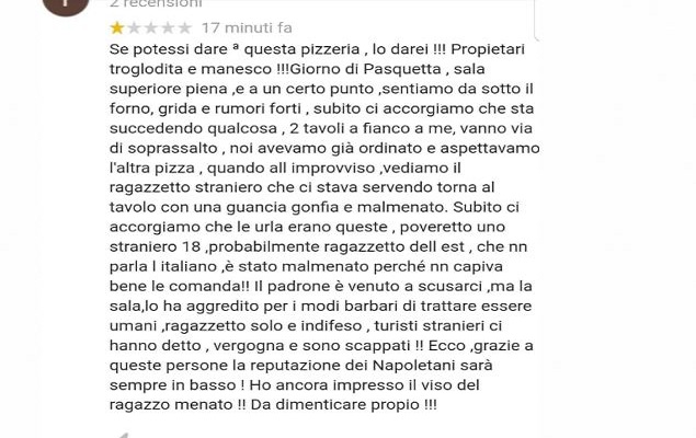 Napoli – “Un giovane cameriere dell’Est sarebbe stato preso a schiaffi da altri membri del personale di una pizzeria di via Tribunali a Napoli. Il fatto sarebbe emerso in seguito ad una recensione su Tripadvisor che avrebbe reso noto l’accaduto”. La denuncia arriva dal consigliere regionale dei Verdi Francesco Emilio Borrelli e dallo speaker radiofonico Gianni Simioli. “Il cameriere, deputato a prendere le comande, sarebbe arrivato ai tavoli quasi in lacrime e con i segni dello schiaffo in pieno viso. Stando al racconto di alcuni avventori la scena avrebbe provocato l’indignazione dei presenti con alcune persone che avrebbero abbandonato la pizzeria. Una ragazza ha raccontato durante “La Radiazza” su Radio Marte che il proprietario si sarebbe presentato in sala per giustificarsi, affermando che il ragazzo, non riportando correttamente le comande, avrebbe potuto omettere intolleranze e allergie”.