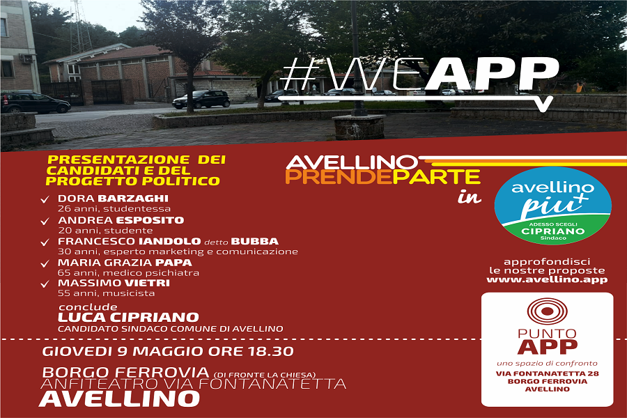 9 maggio quadratoAvellino – Giovedì 9 Maggio alle 18:30 nell’anfiteatro di via Fontanatetta saranno presentate le candidature di APP- Avellino Prende Parte ( Dora Barzaghi, Andrea Esposito, Francesco “Bubba” Iandolo, Maria Grazia Papa e Massimo Vietri) in un assemblea pubblica all’aperto che vedrà anche la partecipazione del candidato a sindaco della coalizione Luca Cipriano.