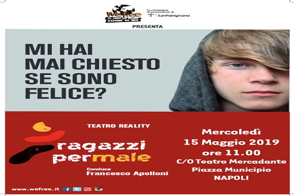 Mercoledì 15 maggio alle 11.00 presso il teatro Mercadante verrà messo in scena nell’ambito della campagna di prevenzione WeFree, ideata dalla Comunità di San Patrignano, lo spettacolo “Ragazzi Permale”. Allo spettacolo parteciperanno 500 alunni provenienti dalle Scuole Secondarie di primo grado di Napoli.