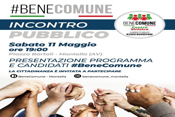 Montella – Nuovo appuntamento pubblico per “Bene Comune”, la lista che vede Rino Buonopane candidato alla carica di Sindaco di Montella. Sabato 11 maggio, alle ore 19.00, nella centralissima Piazza Bartoli, la compagine presenterà i candidati al Consiglio Comunale e il suo programma amministrativo.“Invito i cittadini di Montella a partecipare a questa nostra manifestazione – afferma Buonopane – affinché conoscano il percorso che intendiamo seguire qualora ci dovessero riconoscere la loro fiducia. La nostra lista, già da adesso, vuole essere luogo e momento di condivisione e partecipazione. E i cittadini dovranno essere i protagonisti per il Bene Comune.“