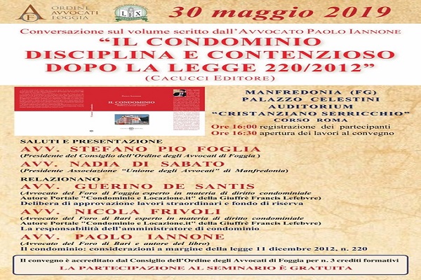Manfredonia - Si terrà giovedì 30 maggio, alle ore 16, all’auditorium “Cristanziano Serricchio”, Palazzo Celestini, Manfredonia (FG) la presentazione dell’ultimo libro dell’avvocato Paolo Iannone in materia condominiale, con organizzazione dell’evento formativo a cura dell’Associazione Unione degli Avvocati di Manfredonia con il supporto e il patrocinio dell’Ordine degli Avvocati di Foggia.
