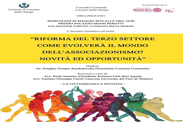 Cassano delle Murge – Si terrà mercoledì 29 maggio, alle ore 18, presso Palazzo Miani Perotti in Cassano delle Murge (BA) il seminario informativo sulla riforma del Terzo Settore e le sue conseguenze nel mondo dell’associazionismo.