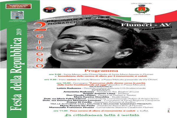 Flumeri – Il prossimo 2 giugno 2019 Festa della Repubblica Italiana e delle Forze Armate, Flumeri celebrerà i 73 anni per ricordare quando il popolo italiano, scelse la via della democrazia.