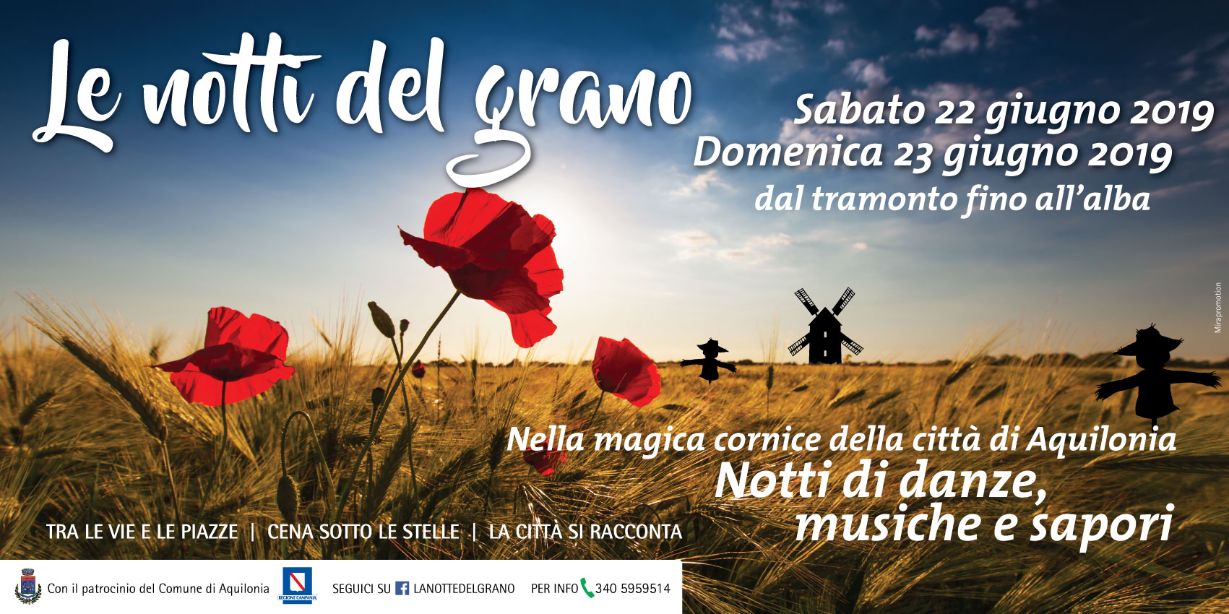 Archiviata la festa patronale di San Vito Martire tenutasi lo scorso week-end, Aquilonia si appresta a vivere un altro fine settimana di festa. E che festa! E’ infatti in programma la settima edizione de “LE NOTTI DEL GRANO.Un evento-progetto, questo, nato dall’idea del sindaco Giancarlo De Vito e magistralmente portato avanti dall’associazione no profit “Le Notti del Grano“.Quest’anno le responsabili di questa fattiva associazione, (un gruppo di ragazze, che con grande passione e forte abnegazione e con l’ausilio di volontari del posto, ogni anno cura materialmente la manifestazione) ha stilato un programma di tutto rispetto.La festa si articolerà in due giorni : SABATO 22 e DOMENICA 23 GIUGNO. Gli eventi in programma sabato 22 si svolgeranno tutti in paese.