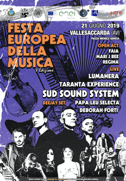 Anche Vallesaccarda quest’anno celebrerà la Festa della Musica, un vero e proprio fenomeno sociale e culturale che si svolge contemporaneamente in tutta Europa nel giorno del solstizio d’Estate. Attesissima infatti è la Kermesse vallesaccardese grazie anche alle grandi edizioni del passato prodotte dalla Montecristo ma soprattutto grazie alla Line Up 2019 che vedrà alternarsi sul palco di Piazza Addesa tanti artisti di calibro nazionale ed internazionale. Una commistione di suoni e culture che prevede anche lo straordinario concerto dei SUD SOUND SYSTEM, Band Salentina pioniera del raggamaffin italiano che combina ritmi giamaicani a dancehhal reggae. Ma ad avvicendarsi sullo stage anche FAIA, REGINA, MARI J BEE, LUMANERA, GIULIANO GABRIELE, TARANTA EXPERIENCE, PAPA LEU. La chiusura della festa invece a notte inoltrata è affidata invece al potentissimo sound della DJ romana DEBORAH FORTI tra le più influenti woman discjockey italiane del momento. Atteso a sorpresa anche un importante ospite musicale che gli organizzatori hanno annunciato senza svelarne il nome. Insomma una notte da annoverare sicuramente negli eventi di spicco dell’irpinia e dell’intera regione, e non solo vista anche l’entità dell’evento sono attese infatti persone e fans anche dalla vicina Puglia. Una manifestazione patrocinata dal Comune di Vallesaccarda, Siae, Ministero dei beni Culturali e dalla commissione europea oltre che promossa da diversi partners e sponsor italiani ed internazionali.
