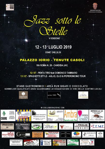 L’Amministrazione Comunale di Candida, in collaborazione con la Proloco, organizza per il prossimo 12 e 13 luglio 2019, la VI Edizione della Manifestazione “Jazz sotto le Stelle”. In uno scenario incantevole, “Palazzo Iorio-Tenuta Casoli”, si potranno degustare ottimi prodotti tipici, accompagnati da eccellenti vini, prodotti da Cantine locali., ascoltando musica Jazz.