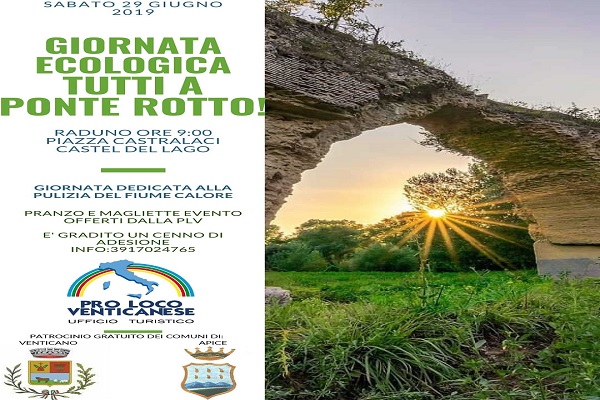 giornata-ecologica-tutti-a-ponte-rotto-1-1Castel del Lago - “Tutti a Ponte Rotto”. E’ l’appello lanciato, anche attraverso i social, dalla Pro Loco di Venticano presieduta da Luigi Villani, in occasione della giornata ecologica in programma per domani 29 giugno 2019.