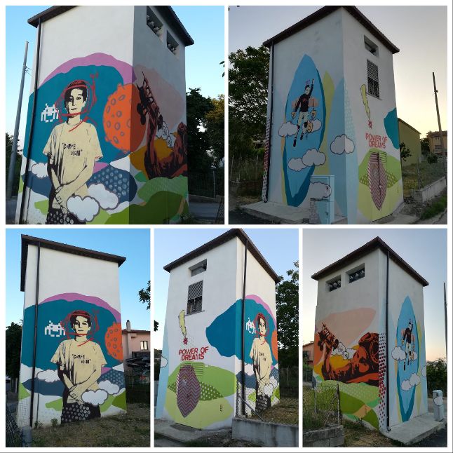 Alessandra Carloni, artista già molto affermata con all’attivo diverse mostre in prestigiose gallerie, ha rappresentato con il suo tratto inconfondibile un “Contenitore di Energia”, questo il titolo della sua opera. Nella sua rappresentazione onirica e giocosa ci sono tutti gli elementi che richiamano al territorio e che si mescolano con elementi peculiari che l’artista utilizza sempre per rappresentare la fantasia e la creatività, in una sinergia che trasmette chiaro un messaggio di energia e movimento. Biodipi, al secolo Fabio Della Ratta, bravissimo artista che ha fatto del fumetto il suo tratto distintivo, ha rappresentato un’opera intitolata “Power of dreams” che vuole esprimere la potenza del sogno, la capacità di rimanere affascinati dalla vita, è un’esortazione a dare senso all’esistenza, a dare significato e valore alle conquiste umane.