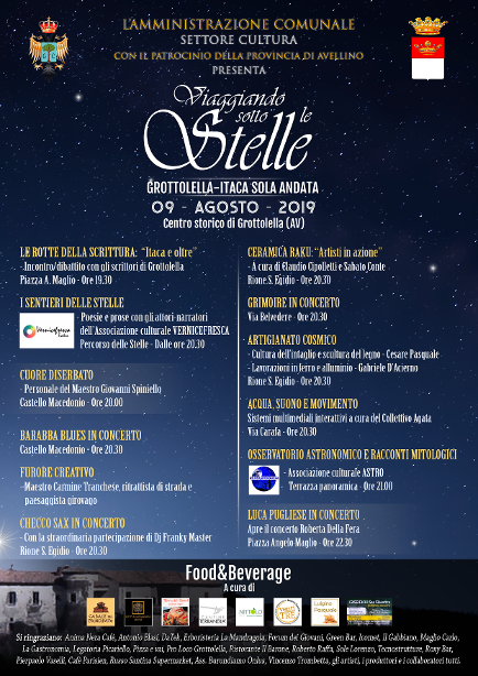 Sarà inaugurata venerdì 9 agosto 2019 la prima edizione di “Viaggiando sotto le stelle”. Grottolella-Itaca sola andata, la nuova collettiva d’arte promossa dall’amministrazione comunale di Grottolella -Settore Cultura-. La rassegna, che unisce musica, teatro, scrittura, artigianato, pittura, scultura e astronomia, nasce con l’obiettivo di offrire al visitatore la possibilità di compiere un’esperienza sensoriale senza eguali. Quando si parla di cultura e viaggi, l’attenzione non può che ricadere sul viaggiatore per antonomasia: Ulisse. Rifacendosi alla poesia di Costantino Kavafis, il gruppo, guidato dal sindaco Antonio Spiniello, ha voluto riportare in vita uno dei personaggi più affascinanti della mitologia greca e servirsi della sua curiosità, proiettandola all’interno del nostro tempo. L’eroe e Itaca sono un binomio perfetto: l’uomo e quello che dovrebbe essere il suo pieno compimento. Un viaggio che non va affrettato con approdi prematuri. Meglio arrivare con la giusta maturità, proprio come Ulisse. Più che la meta, è il viaggio che conta, in quanto occasione di conoscenza, fonte di ricchezze immateriali. È, dunque, lo stimolo per conoscere ed apprendere, senza mai tirarsi indietro di fronte alle avversità. Grottolella – Itaca vuole essere il primo di una lunga serie di viaggi che avranno come obiettivo quello di condurre il pubblico nei meandri più nascosti della cultura universale, partendo dal piccolo borgo irpino, attraverso ogni forma d’arte.