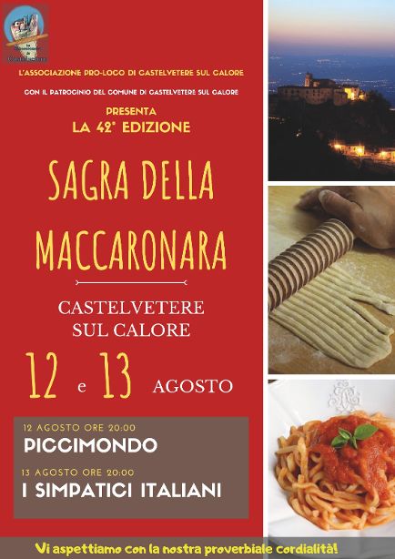 Condivisione, sapori genuini, sano divertimento e riscoperta dell’antico sono i valori che rappresentano il filo conduttore di un evento che non mancherà di sorprendere e conquistare cuori e palati. La Sagra della Maccaronara è organizzata dall’Associazione Pro Loco di Castelvetere sul Calore con il patrocino del Comune di Castelvetere sul Calore.