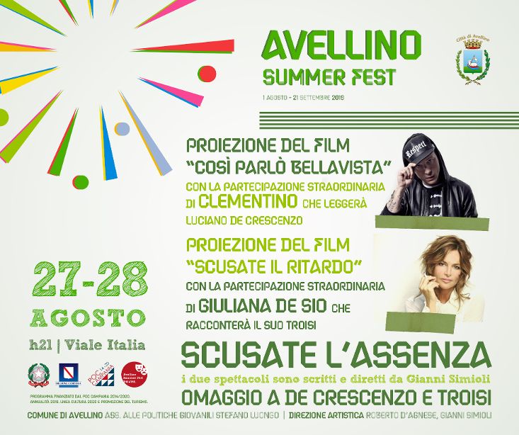 avellino summer festQuesta sera prenderà il via la prima serata dell’iniziativa “Scusate l’assenza”, scritta e diretta da Gianni Simioli. La prima serata sarà dedicata a Luciano De Crescenzo e prima della proiezione del film “Così parló Bellavista”, ci sarà l’intervento di Clementino che leggerà delle poesie di De Crescenzo. La seconda serata, dedicata a Troisi, e che si svolgerà domani, vedrà protagonista Giuliana De Sio, con la partecipazione straordinaria di Sal Da Vinci.  I due eventi si svolgeranno a Viale Italia, nei pressi del piazzale della Chiesa di San Ciro.