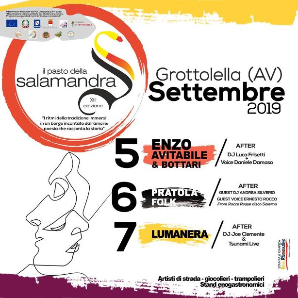 La tredicesima edizione del Pasto della Salamandra, finanziata dal Programma Operativo Complementare (POC) 2014-2020, prenderà il via giovedì 5 settembre, con i suoni antichi di Enzo Avitabile e dei Bottari, in una bellissima cornice di stand, mostre culturali e diversi eventi folkloristici. Venerdì 6 settembre si esibiranno i Pratola Folk, gruppo seguitissimo soprattutto dalle nuove generazioni e dai giovanissimi non solo della Provincia di Avellino. Nella serata conclusiva di sabato 7 settembre, invece sarà la volta del gruppo dei Lumanera, il quale ha avuto un grande successo durante l’estate 2019 e non nuovo per il Pasto della Salamandra.