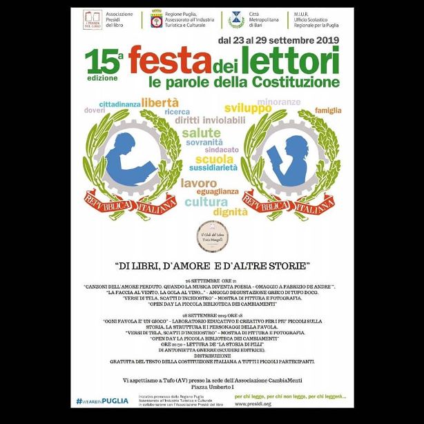 Per la prima volta sbarca a Tufo (AV) la “Festa dei Lettori”, evento a carattere nazionale promosso dal circuito Presìdi del Libro: sarà il “Club del Libro Troisi Mongelli”, nato in seno all’Associazione socioculturale CambiaMenti e divenuto ad Agosto “Presìdio del Libro di Tufo”, ad organizzare l’iniziativa. La Festa, che, nell’edizione tufese, è intitolata “Di libri, d’amore e d’altre storie”, prenderà il via Giovedì 26 Settembre, alle ore 21, presso la sede dell’Associazione CambiaMenti, sita in Piazza Umberto I, con “Canzoni dell’amore perduto. Quando la musica diventa poesia”, appuntamento che vedrà come ospite il DuoAndrè. Seguirà un dibattito su “Le Parole della Costituzione” e sarà possibile ristorarsi presso l’angolo degustazioni di Greco di Tufo DOCG “La faccia al vento, la gola al vino…”.