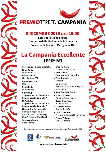 Torna, per la sua sesta edizione, il “Premio Terre di Campania” riconoscimento istituito nel 2014 dall’Associazione Culturale Terre di Campania quale riconoscimento alle personalità campane che per il loro operato, si sono distinte in vari campi: enogastronomia, cultura, arte, spettacolo, impresa, ricerca, turismo, mondo sociale, sport. Venerdì 6 dicembre 2019, a partire dalle 19.30, presso il Santuario della Madonna della Speranza, Convento dei Frati Minori di San Vito in Marigliano, si terrà la cerimonia di consegna dei premi assegnati da una speciale commissione composta da personalità di spicco del nostro territorio. La serata sarà presentata dalla conduttrice di Canale 9, Mariù Adamo. Tra i premiati di quest’anno figurano: Vincenzo Calise, vice-direttore del Tg2; Franco Roberti, magistrato ed eurodeputato; Maria Felicia De Laurentiis, Prof.ssa di Astronomia e Astrofisica alla Federico II di Napoli e il Duo Ebbanesis.