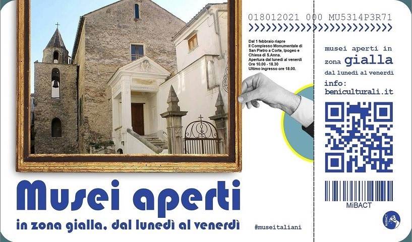 La Soprintendenza ABAP di Salerno e Avellino, diretta da Francesca Casule, apre il complesso monumentale di San Pietro a Corte (Ipogeo e Cappella Sant’Anna) nel centro storico di Salerno, con il seguente orario: 10.00 /18.00 dal lunedì al venerdì. L’ingresso è gratuito. La visita al sito si svolgerà nel rispetto delle norme anti COVID 19: limite contingentato di accesso a tre visitatori per volta.