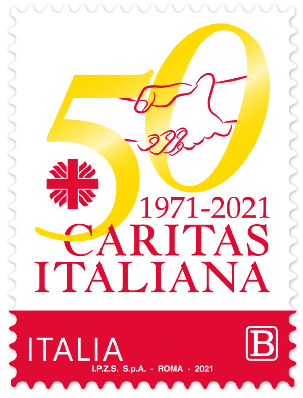 La vignetta riproduce il logo del 50° anniversario della fondazione Caritas Italiana in cui sono presenti la croce a raggiera, particolare tratto dal marchio della Caritas Italiana, il “50” a indicare gli anni trascorsi dalla fondazione dell’organismo pastorale, due mani che si stringono, emblema di solidarietà, gli anni “1971-2021” e la scritta “CARITAS ITALIANA”.