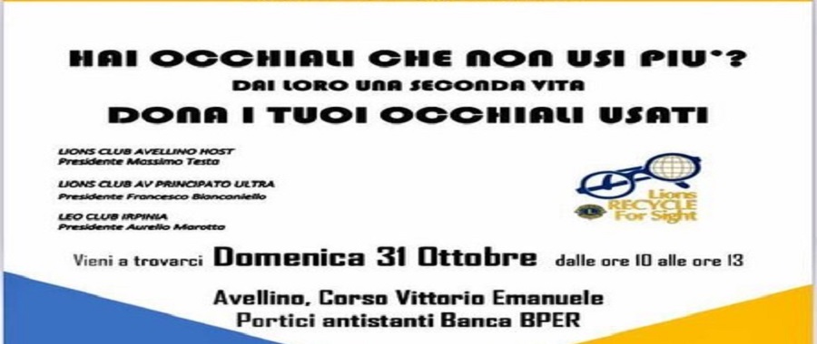 Avellino – Il Lions Club International Avellino Host presieduto dal Maestro Massimo Testa, in collaborazione con il Lions Club Avellino Principato Ultra, presieduto dal Dott. Francesco Biancaniello, e il Leo Club Irpinia, presieduto da Aurelio Mottola, sono lieti di invitarvi all’iniziativa “Dona i tuoi occhiali usati”, che avrà luogo domenica 31 ottobre dalle ore 10.00 alle 13.00 ad Avellino, Corso Vittorio Emanuele, portici antistanti Banca BPER.